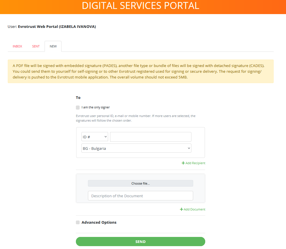 2. Избор на файл – прикачвате нужните документи, които искате да подпишете. Ако ще има и други подписващи, които ще участват в процеса, трябва да отбележите чекбокса "Добави подписващ". След това прикачвате и документа към заявката, като може да изберете дали да го прегледате преди да се изпрати. При "Разрешени настройки (Advanced Options)" имате опцията да отбележите дали да се съхраняват в портала или не. Също така дали да бъде видима анотацията на подписа в документа.