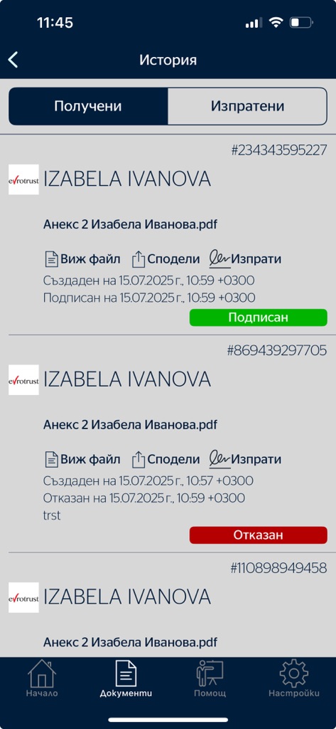 3. След като го изпратите за подпис, получателят ще получи нотификация, че има чакащ документ за подписване. След като бъде подписан, документите ще бъдат преместени в таб "Получени" в мобилното приложение "Evrotrust". В история може да видите документите, които са подписани или отказани.