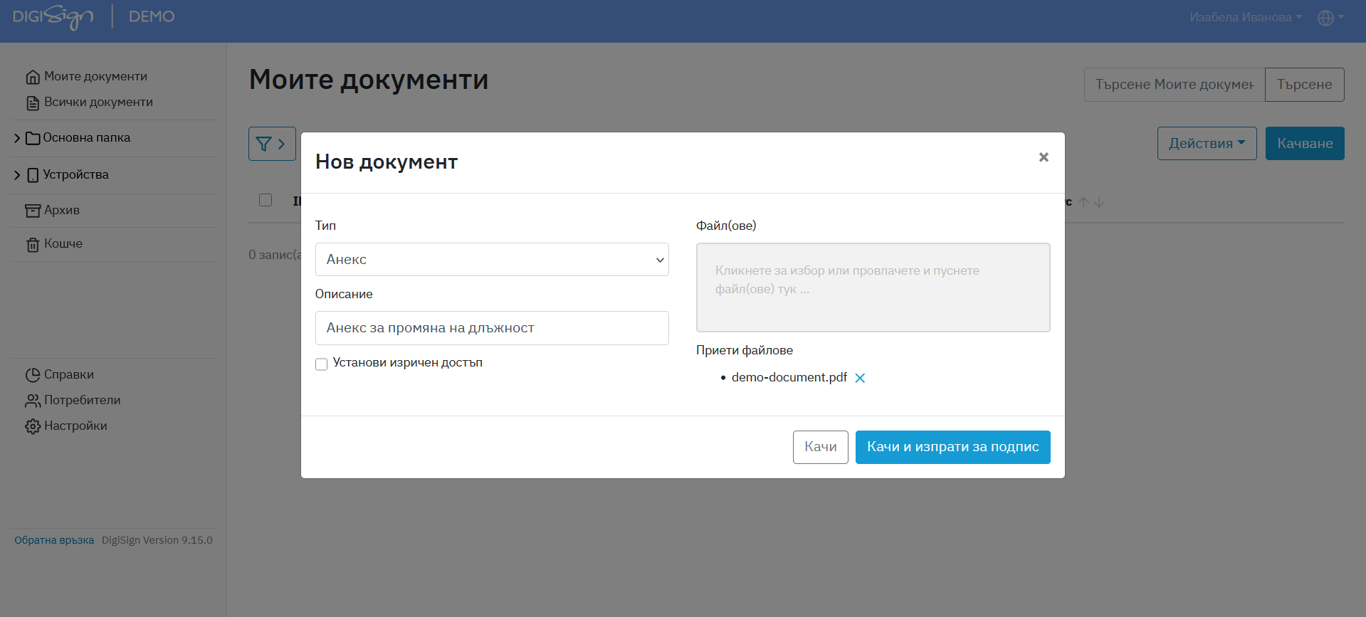 1. От бутона "Качване" избираме какъв документ ще изпратим за подпис, вписваме неговото описание и прикачваме файла.