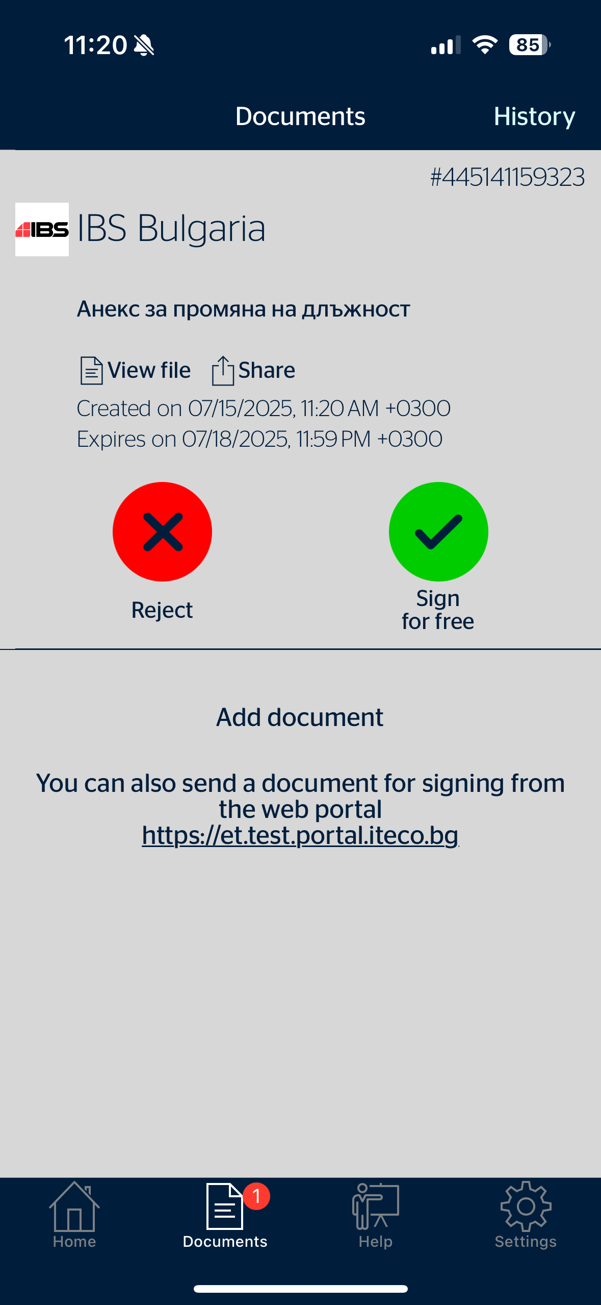 3. След като изпратите документа, подписващите страни ще получат нотификация (push notification) в мобилното приложение на Evrotrust. След като отворят приложението, ще видят документа, като ще имат опцията да подпишат или да откажат.