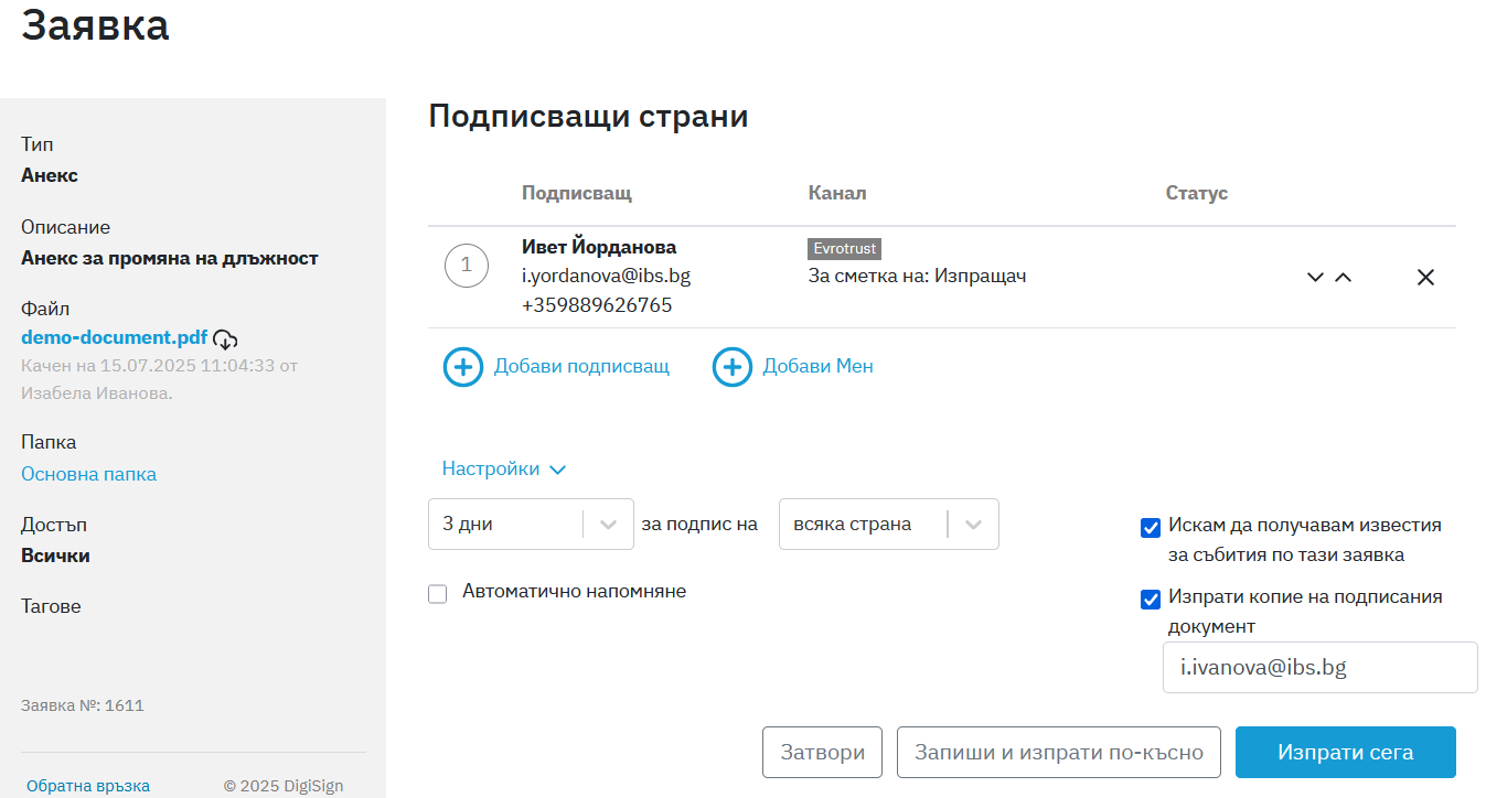 Можете да изберете дали да получавате нотификации по заявката и да изпратите копие на документа на друг човек, който не участва в процеса на подписване.