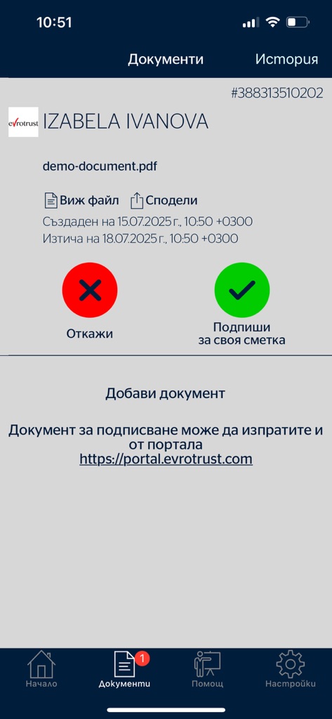 3. След като натиснете бутона "Подпиши", в мобилното приложение на Евротръст ще получите съответната нотификация. След като отворите заявката за подписване, имате две опции – "Откажи" и "Подпиши". След като бъде подписан, може да го свалите и да го съхраните на място по ваше усмотрение.