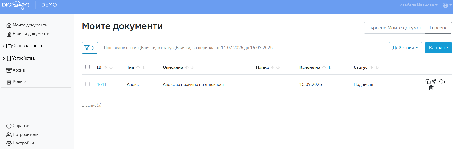 4. След като документа бъде подписан, автоматично се обработва и в DigiSign със статус "Подписан". Така по всяко време може да бъде свален и да се съхрани в съответната система – например в електронното трудово досие, в системата за управление на взаимоотношенията с клиенти (CRM) или в друго документно хранилище.